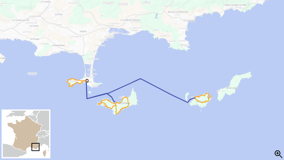 Face au massif des Maures, au large de la presqu’île de Giens, les 3 îles d'Hyères (Porquerolles, Port-Cros et Vile du Levant) sont restées intactes et demeurent aujourd'hui les derniers témoins de ce que la Côte d'Azur fût avant de se laisser noyer sous le béton.